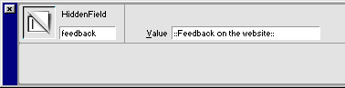 We select the hidden form field by clicking on it, give it a name in the PI as above; in this instance the name is feedback. On this occasion we have added a value to the hidden field and that value is: :: Feedback on the web site :: we can place this hidden field to appear anywhere we want in the returned information and use it is as a separator. On a more complex form I would use several of these "separators" to break the returned data down into titled sections, creating blocks of information that are relevant to each other.